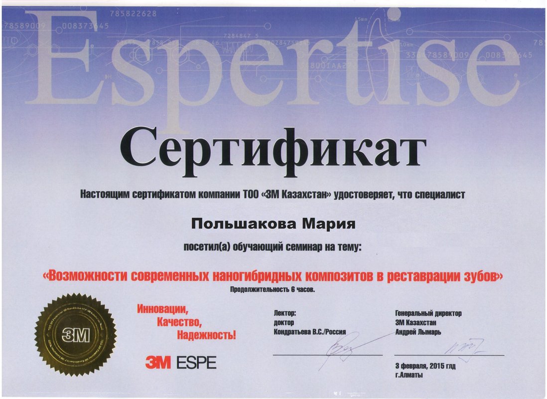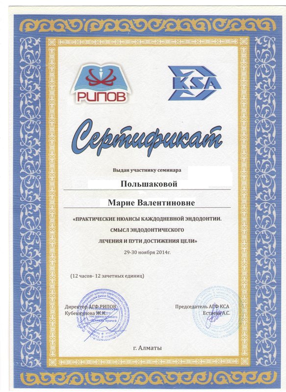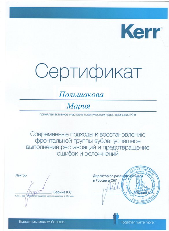 Польшакова Мария Валентиновна является стоматологом-терапевтом. Мария Польшакова в том числе проводит реставрацию зубов, выполняет герметизацию фиссур, а также специализируется на заболеваниях полости рта. Вы можете обратиться к дантисту не только если вас беспокоит состояние зубов, но также при болезнях слизистой языка, щек, десен или неба.